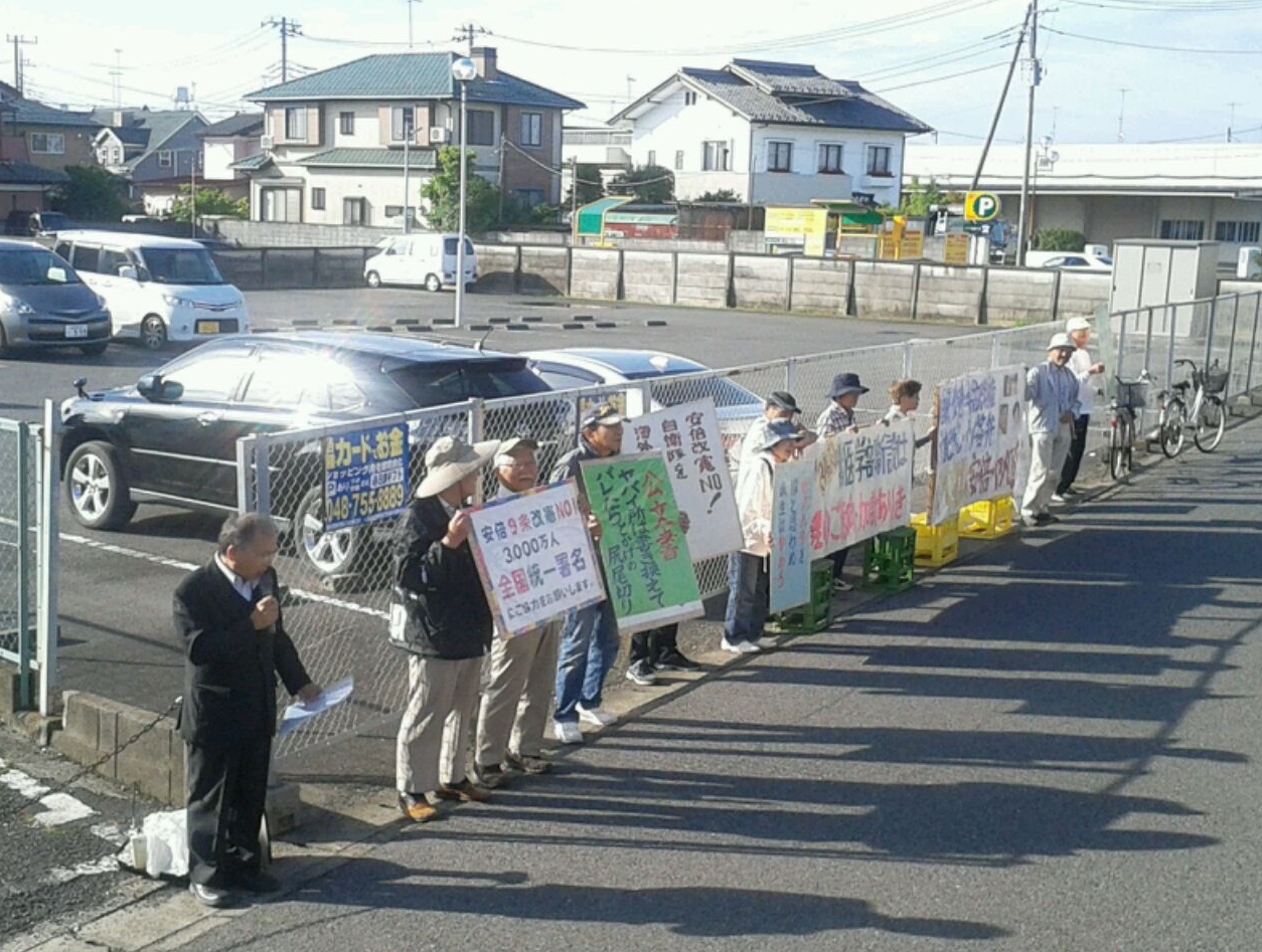 栗橋駅ご利用の皆さん おはようございます。私たちは戦争法廃棄栗橋の会です。今日は6月19日です。安倍政権が安保法制を強行した日でもあります。今日は、安倍改憲ノー 憲法9条守ろう 全国統一3000万人署名の訴えをしています。