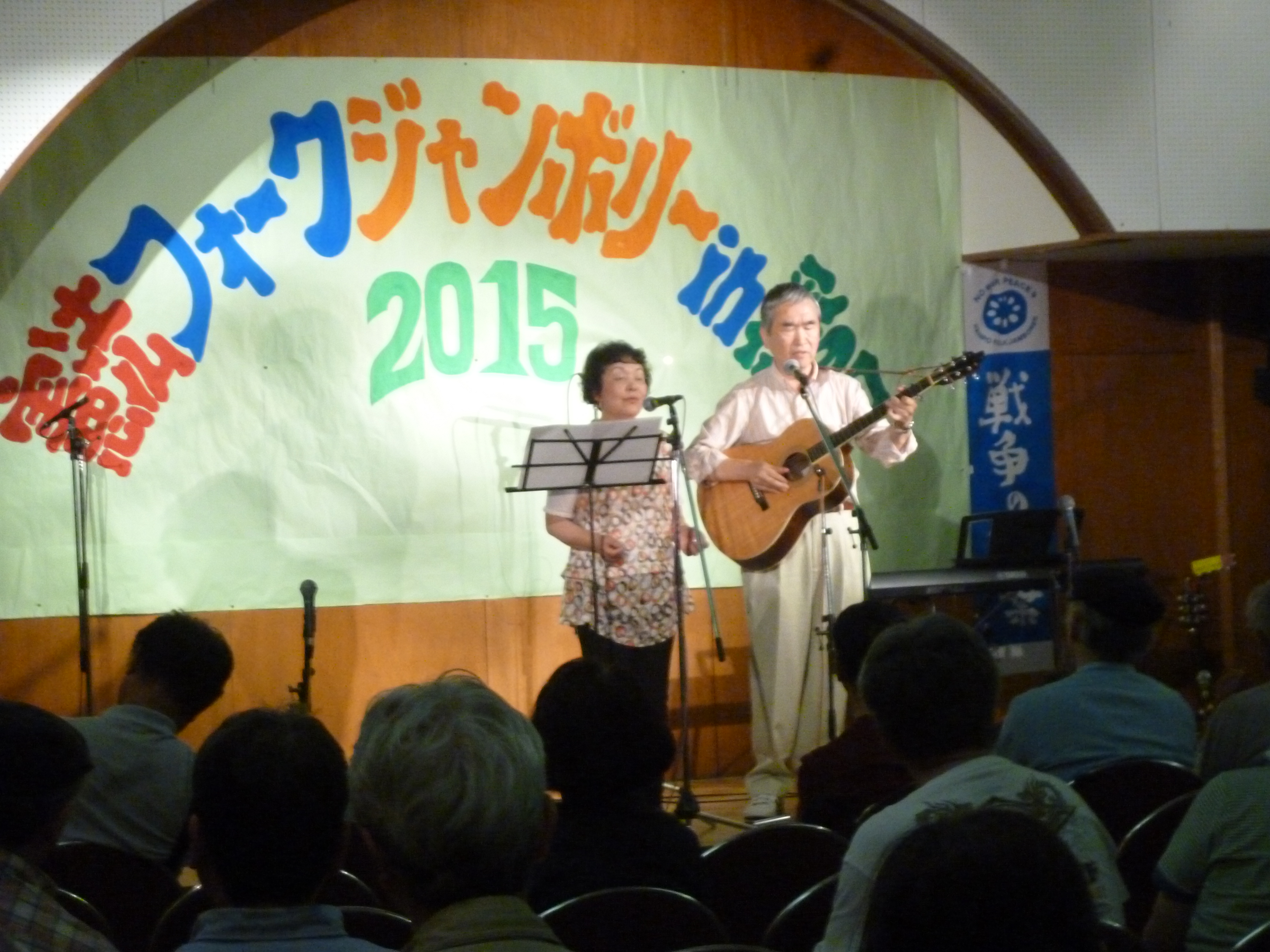 久喜市では、昨年に引き続き、3回目となる憲法フォークジャンボリーが、5月4日中央公民館で開かれました。写真のお二人は、中心となり会を進め、実行委員会を立ち上げ、ご苦労をしていただいた方です。この方達を含め多くの方々の力で、憲法を守ろう、平和を守ろう、の声、歌声、音楽が響きわたりました。