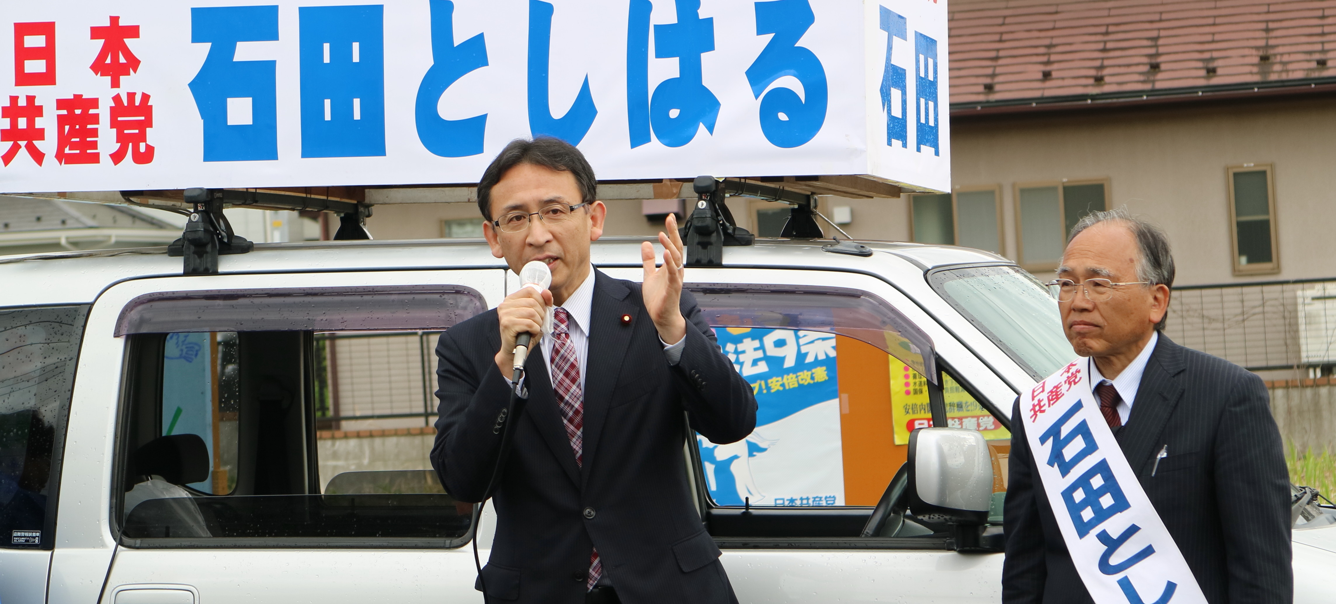 (塩川てつや衆院議員の応援を受けて頑張る・石田としはる候補)