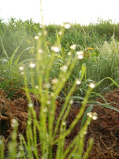 最近では「鬼のように熱い」というらしいが、少しヤケになって言うと「毎日気持ちいいくらいの」暑さです。いつものように早朝の新聞配達をしていると、鷲宮八甫地内で見かけた光景(写真の)が目に飛び込んできました。辺りじゅうの草木の先端に朝露が自然の真珠を造っていました。 しばし足を止めて見入った次第です。