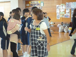 10月3日、12日、16日、の3日間久喜中学校の家庭科の授業として、保育と命の学習のお手伝いをしてきました。たくさんの0・1・2・3・4・歳児をつれたお母さんたちが中学校へきてくれました。中学3年生のこどもたち?は初めのうちは控えめでしたが、小さい子どもをだっこしたり、段ボールの車に乗せたり風船あそびなどをしているうちにとてもにこやかになっていました。