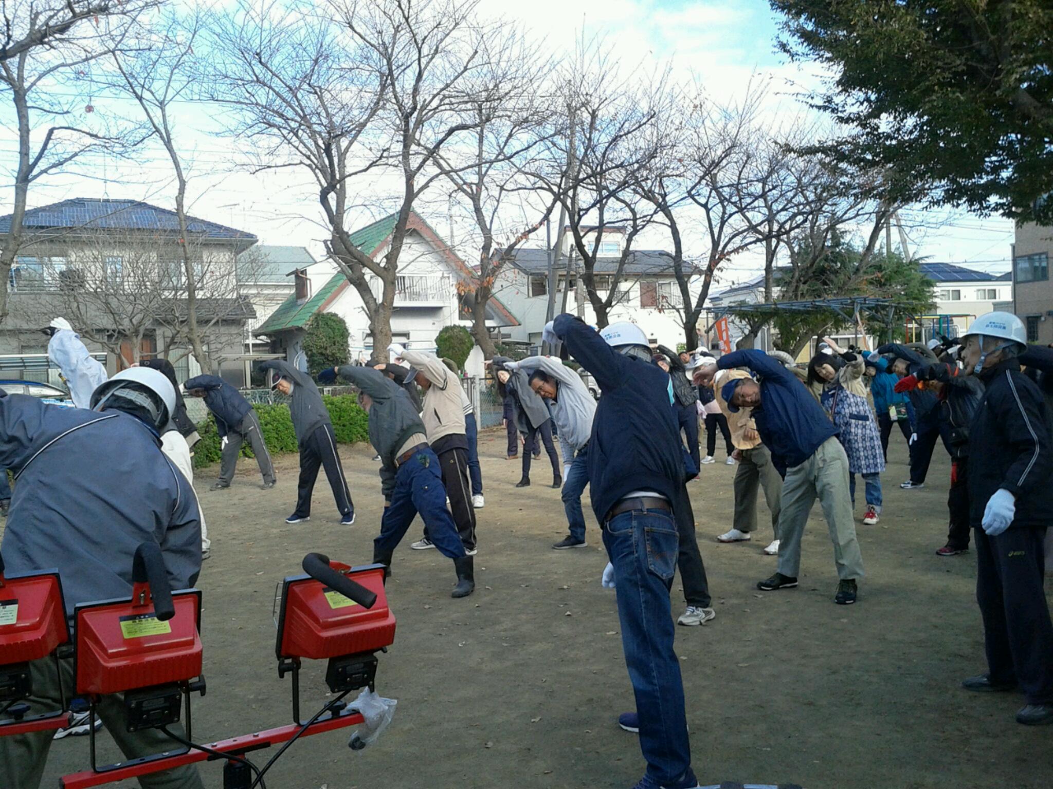 2018年11月25日 公園にあつまり防災訓練が行われました。地元の区長さんや自治会の役員さんを中心に勧められました。写真は毛布でタンカーをつくり、負傷した方を運ぶ訓練です。