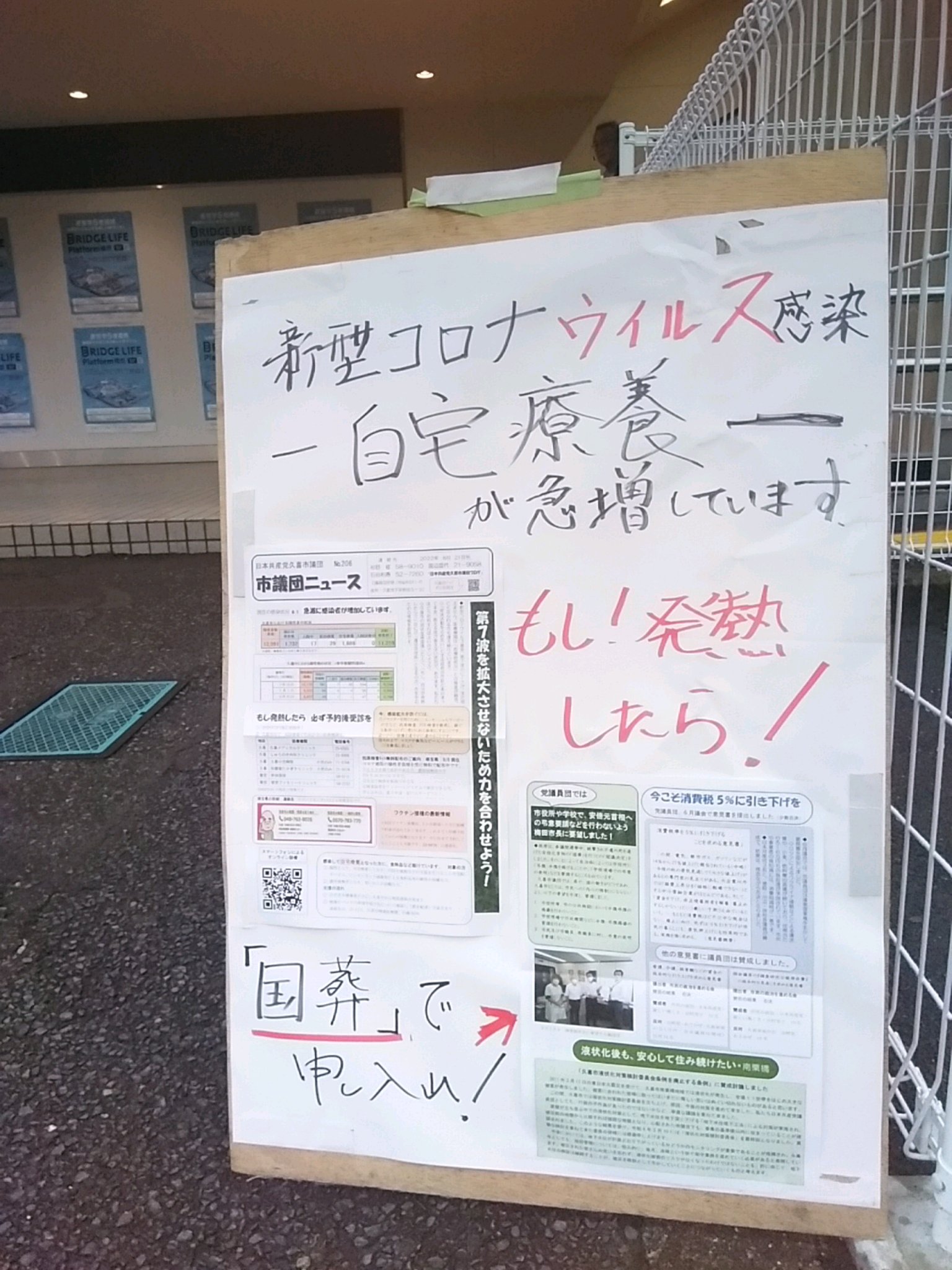 コロナウイルス感染拡大中 声は出さずに駅で配布させていただいています。