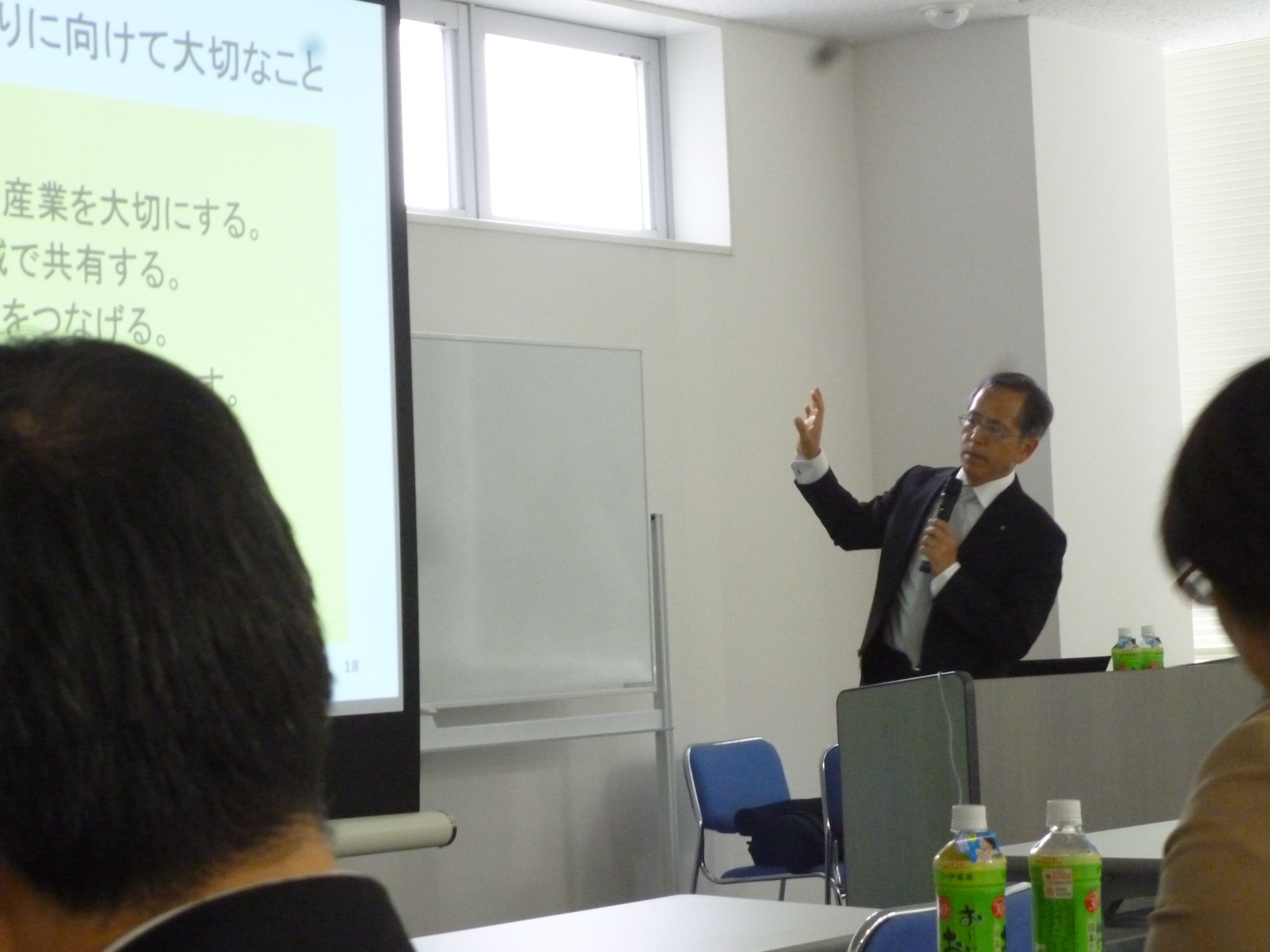 いかに高齢化がすすんでいるか、認知症が進み、人員も事業所も支援も予算も足りないか、だから、地域包括ケアシステムの構築がいかに大事かが、話されました。地域をいかにマネジメントするのかの視点と、住民・自治体・企業・NPOの公民連携が重要と言うことでした。