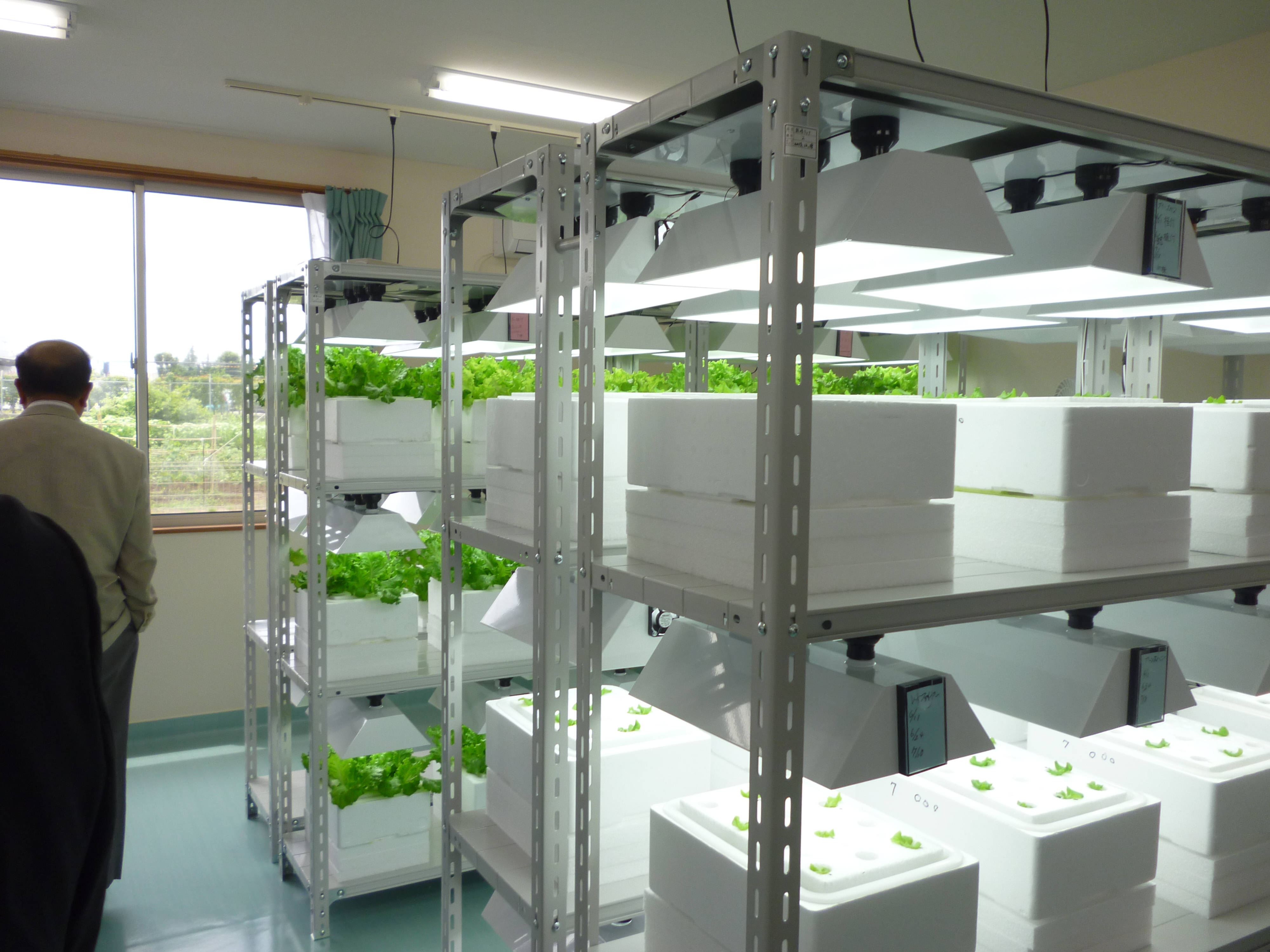 場所は、久喜市江面で、緑ゆたかな中にあります。写真は水耕栽培でピア菜を栽培しているところです。特別な石を使い、光をあて、温度管理を行い育てます。ピア菜は、柔らかく、少しだけ苦みもありますが、とてもおいしい野菜です。契約のお店に出荷しているそうですが、まだまだ、流通販路を拡大しなければとおっしゃっていました。