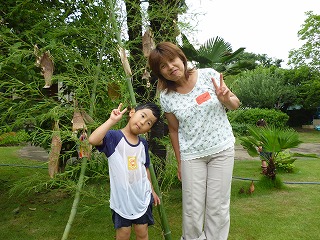 我が家の3番目の長女と4番目の3男と一緒に参加しました。とても広い敷地で水遊び(とても冷たい井戸水で)をさせてもらい、じゃがいもをたくさんとりました。ササの葉も屋敷の中の竹を切り出し、それに、たけのこの皮を干したものに願い事を書きました。(写真のうしろ)